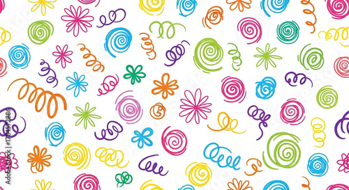 Colorful abstract scribbles and swirls pattern on white background