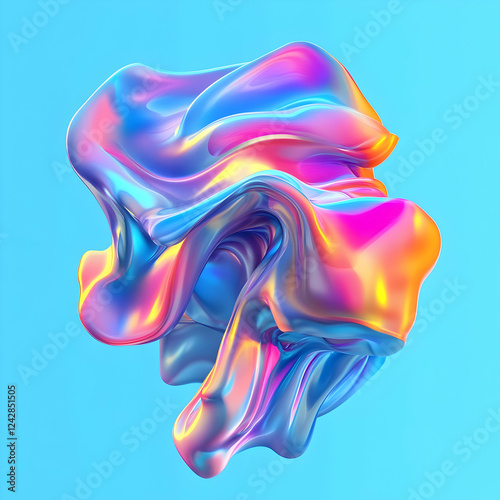 Colorful abstract sculpture floating against a bright blue background, showcasing fluid motion and light