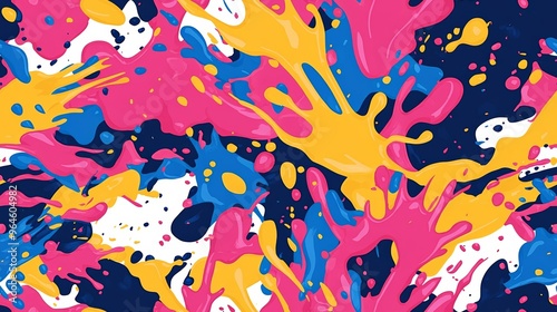 Colorful Abstract Seamless Background with Vibrant Paint Splashes in Pink, Blue, Yellow, and White for Modern Design Projects