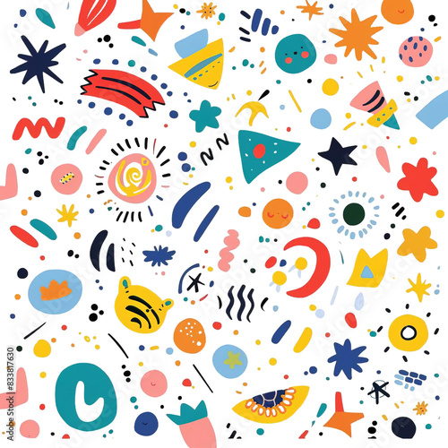 Colorful abstract shapes pattern with various geometric figures and playful doodles, ideal for backgrounds and creative designs.