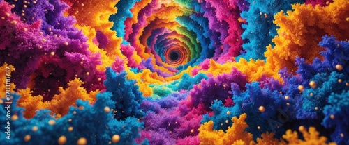 Colorful abstract spiral pattern with vibrant hues of pink, purple, blue, orange and yellow, creating a fractal-like design.