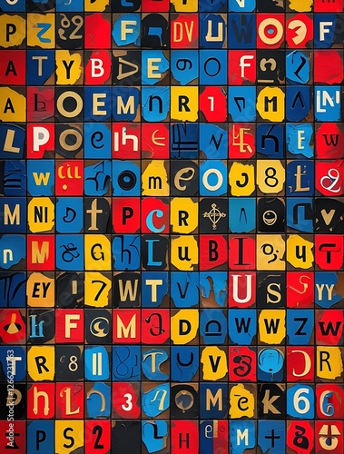 Colorful abstract typography artwork featuring a grid of multicolored letters and symbols, creating a vibrant and dynamic composition that blends design, creativity, and modern aesthetics.