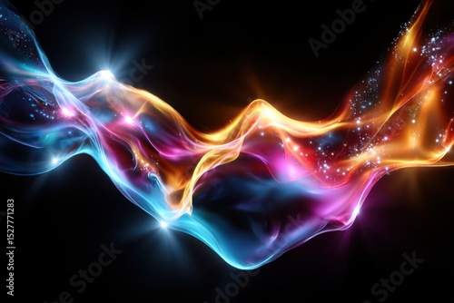 Colorful abstract wave of light with glowing particles and fluid movement in black background