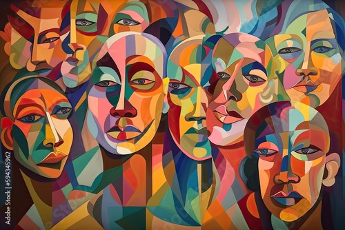 Colorful abstractly painted men's and women's faces. Society concept. Generative AI