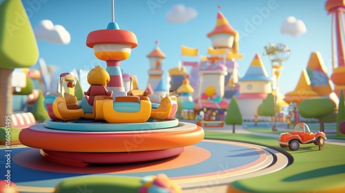 Colorful amusement park scene with whimsical rides and buildings