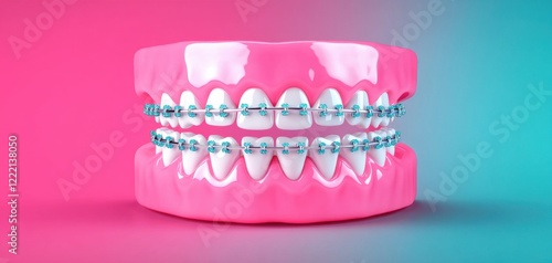 Colorful anatomical model of human teeth with braces, showcasing dental care and orthodontic treatment for a vibrant educational display.