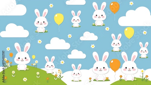 Colorful and cheerful illustration of white bunnies holding balloons and sitting on flower-filled hills under a bright blue sky. The playful layout makes it ideal for children's decor