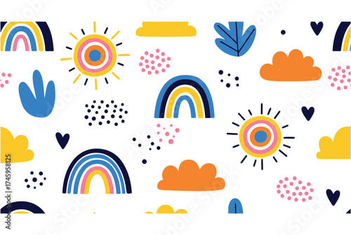 Colorful and whimsical pattern with rainbows, suns, clouds, and hearts, evoking joy and positivity isolated on transparent background