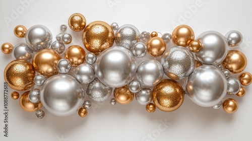 Colorful arrangement of shiny spheres in gold, silver, and glittery textures