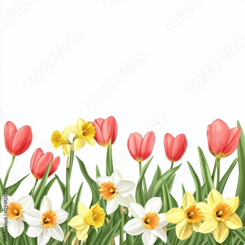 Colorful Arrangement of Various Spring Flowers Including Tulips, Daffodils, and Wildflowers on a White Background