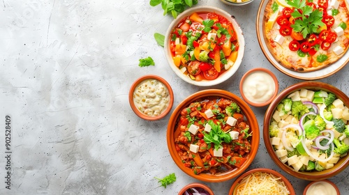 Colorful array of delicious dishes in bowls, featuring fresh vegetables and vibrant flavors on a textured gray surface.