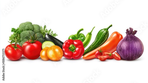 Colorful array of fresh vegetables, featuring tomatoes, peppers, and cucumbers on a white background.