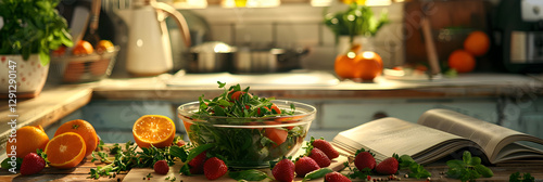Colorful Array of Fruits, Vegetables and Fresh Salad with Open Recipe Book in Rustic Kitchen
