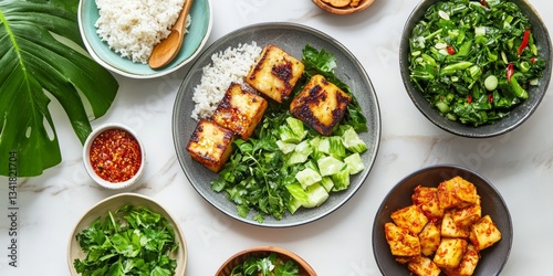 Colorful Array of Healthy Dishes with Tofu, Rice, and Fresh Vegetables