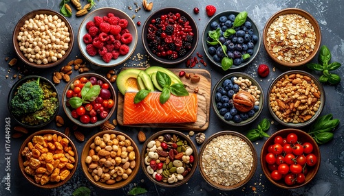 Colorful array of healthy superfoods for a balanced diet and wellbeing.