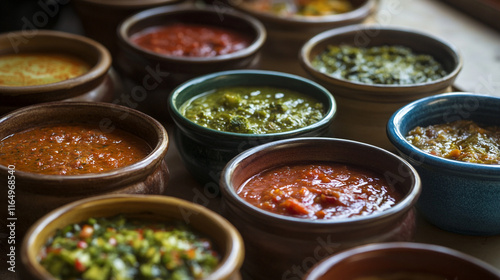 Colorful array of sauces displayed in clay bowls at a local market in the afternoon sunlight