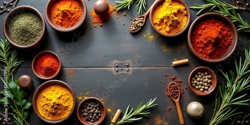 Colorful array of spices in wooden bowls on a dark table, with fresh herbs and scattered seasonings