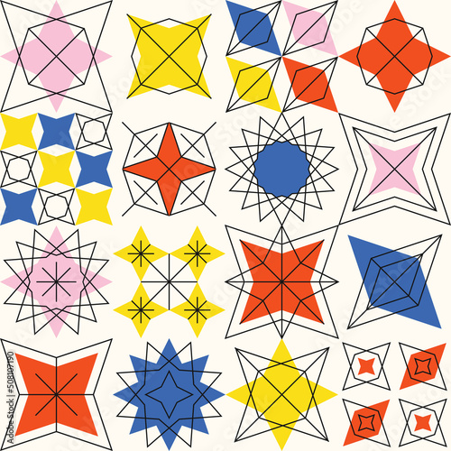 Colorful art background with abstract geometric shapes. Trendy Neo Memphis seamless pattern.