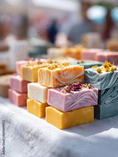 Colorful artisanal soaps, stacked on textured fabric. Representing natural beauty, handcrafted goods, and healthy lifestyle. Great for beauty, spa or product advertisements.