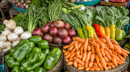 Colorful Asian market vegetable display, vibrant produce, bustling background, food photography