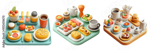 Colorful Assorted Breakfast Trays With Pastries, Fruits, and Drinks On Transparent Background