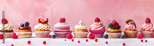 Colorful Assorted Cupcakes and Macarons with Fresh Berries on Pink Background
