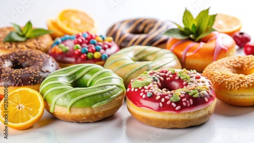 Colorful assorted donuts on a white background with a few fresh fruit slices in the foreground , food arrangement, beauty treats