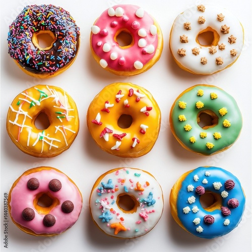 Colorful Assorted Donuts with Sprinkles and Icing on White Background for Sweet Treat Enthusiasts and Bakery Displays