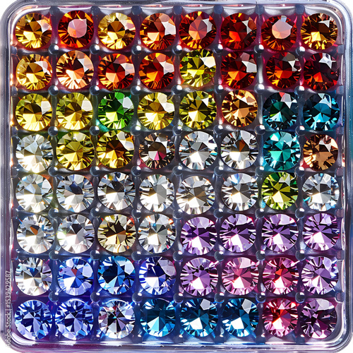 Colorful assorted rhinestones and gems in clear storage case isolated on transparent background
