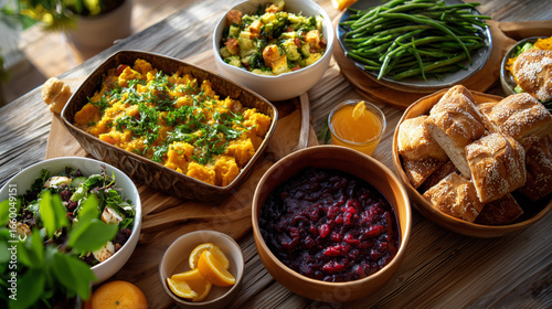 Colorful Assorted Thanksgiving Feast Displayed on a Rustic Wooden Table
