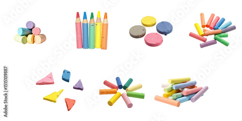 Colorful assortment of chalk pieces including pastel crayons, circular chalk discs, and vibrant chalk sticks arranged artistically on a transparent background.