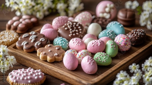 Colorful Assortment of Chocolate and Candy on Wooden Platter