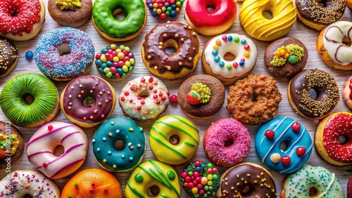 Colorful assortment of creative donuts in diverse flavors and decorations, neatly arranged on a transparent background, captured from above.
