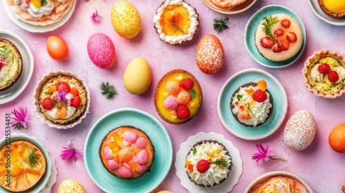 Colorful Assortment of Cute Mini Cakes and Easter Eggs