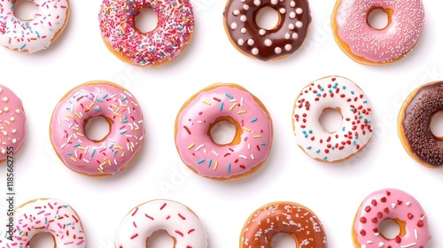 Colorful assortment of donuts arranged in a geometric seamless pattern on a white background for vibrant dessert designs and advertising.