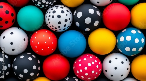 Colorful assortment of eggs with polka dots and stripes. The eggs are arranged in a pattern, with some overlapping and others standing alone. Scene is playful and whimsical