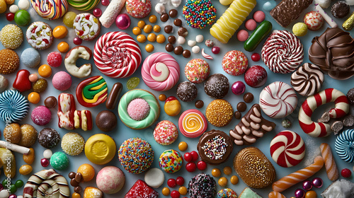 colorful assortment of festive sweets and candies panoramic overhead view confectionery background