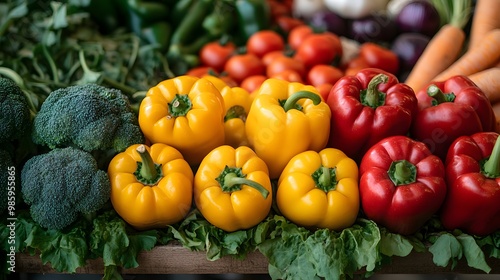 Colorful assortment of fresh vegetables at an organic farmers market, showcasing vibrant produce like bell peppers and tomatoes, emphasizing healthy eating and rich textures.