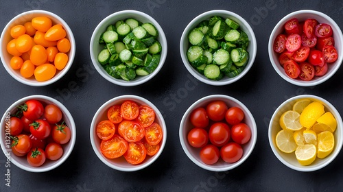 Colorful Assortment of Fresh Vegetables in White Bowls on a Dark Background