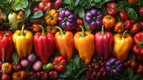 Colorful assortment of fresh vegetables, primarily bell peppers.