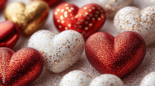 Colorful assortment of glittering hearts in red, white, and gold, perfect for Valentine's Day decor