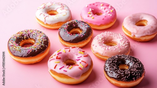 Colorful assortment of gourmet donuts with various sprinkles and icings on a soft pink background ideal for food advertising and promotions.