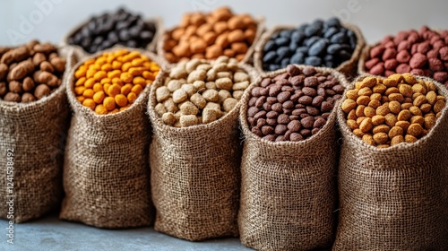 Colorful assortment of nuts and dried fruits in burlap sacks arranged on a table