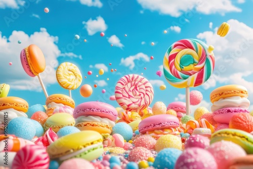Colorful assortment of pastries and lollipops are scattered across a table. Colorful candy landscape featuring vibrant lollipops macarons and sugary treats under a bright blue sky with cloud.