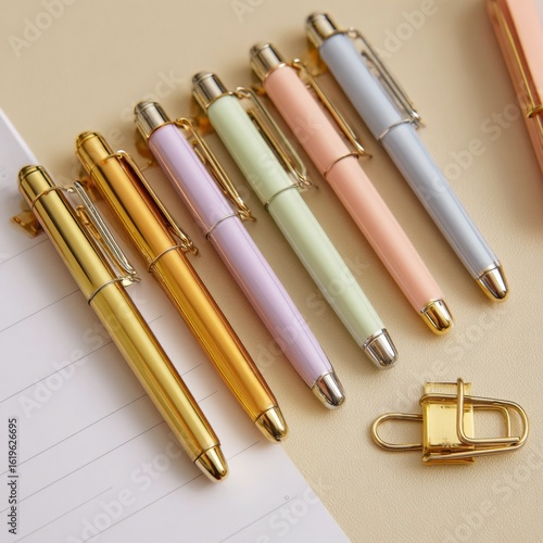 Colorful assortment of pens and a paperclip arranged on a neutral surface, showcasing stationery in a creative layout