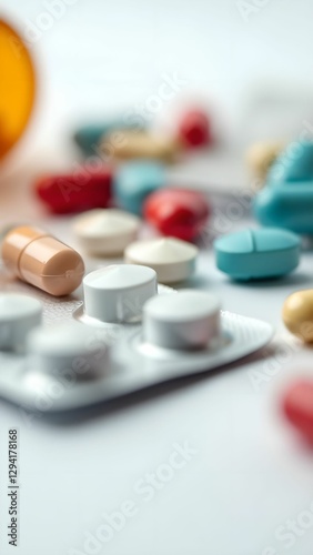 Colorful assortment of pills and capsules scattered on a surface after coming out of a container