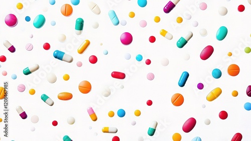 Colorful Assortment of Pills in Various Shapes on a White Background