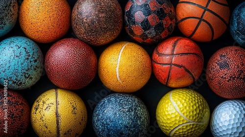 Colorful assortment of sports balls arranged in a vibrant pattern on a dark surface