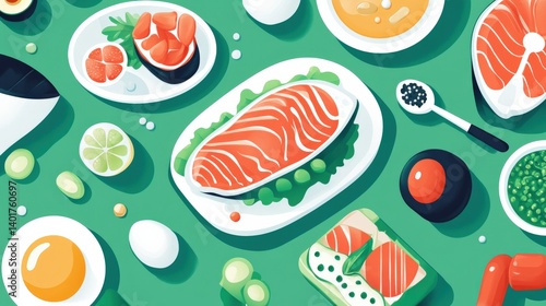 Colorful assortment of sushi and sashimi dishes arranged on a green table, showcasing fresh ingredients