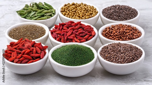 Colorful Assortment of Various Dried Seeds and Grains in Small White Bowls